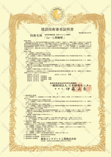 建設技術審査証明協議会会員の(一財)土木研究センターの建設技術審査証明(土木系材料・製品・技術、道路保全技術)を取得。