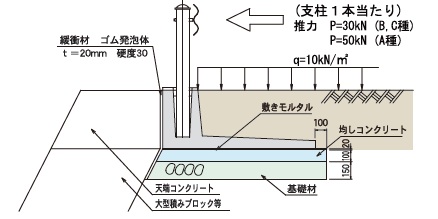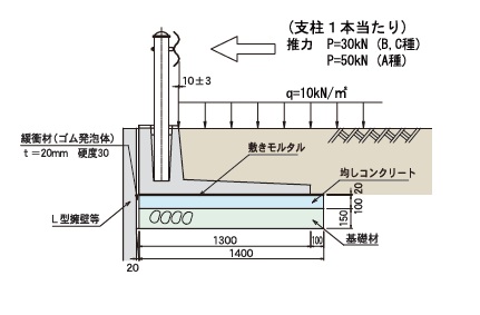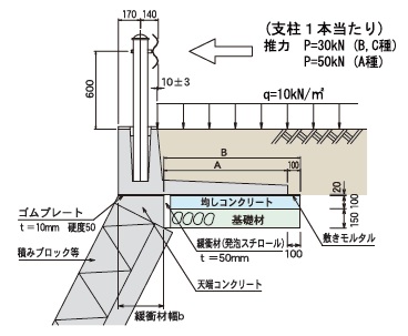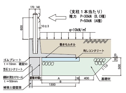 - 擁壁の設計にあたっては、等分布荷重10kN/㎡の自動車荷重に加えて、種別C種・B種ガードレールに作用する推力30kNを考慮してありますので、土圧(試行くさび法により算定)や衝突に対しても十分安全です。